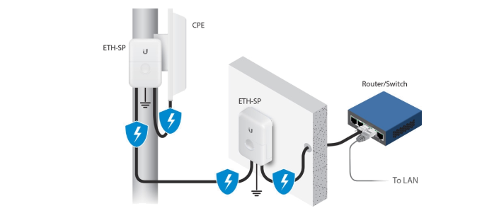 UBNT ETH-SP-G2 je přepěťová ochrana od výrobce Ubiquiti networks pro venkovní jednotky. Jedná se o účinnou ochranu zařízení (včetně PoE napájených zařízení) s rychlostí připojení až 1 Gbps, které umožní přesměrovat škodlivé elektrostatické výboje a přepětí přímo do ETH-SP a zajistí bezpečné uzemnění. Vaše síťová zařízení tak zůstanou vždy chráněna.