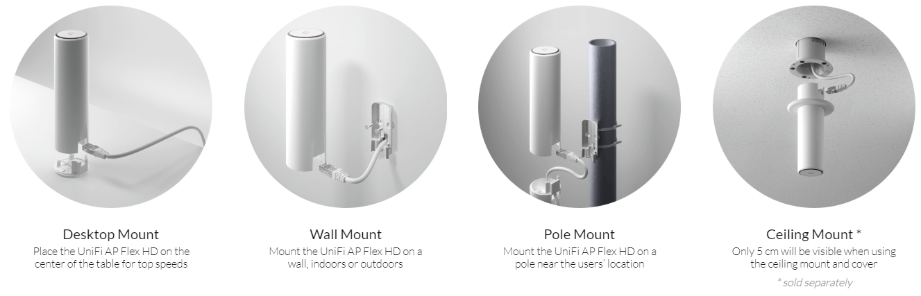 Vhodný pro vnitřní i venkovní použití. Bezproblémová integrace a správa pomocí síťového řešení UniFi. Součástí balení jsou držáky pro montáž na zeď, sloup a stůl. Dokoupit je možné i set pro montáž na strop