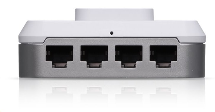 Zařízení je vybaveno také ethernetovým switchem, na spodní straně naleznete 4 Gigabitové ethernety, kdy na prvním portu je možné využít funkci PoE passthough. 1 přívodní Gigabitový port pak naleznete na zadní straně zabudované do zdi.
