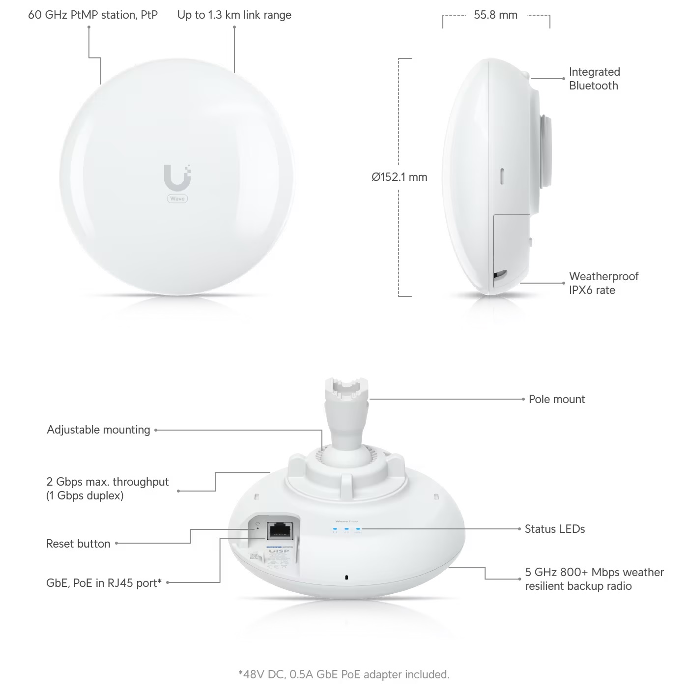 UBNT Wave Pico je 60GHz klientská jednotka s anténním ziskem 27 dBi určená pro PtMP (Point-to-Multipoint) spoje s rychlostí až 2 Gb/s. Jednotka je vybavena 5GHz zálohou s rychlostí 800+ Mb/s pro zachování konektivity i v nepříznivém počasí. Pro co nejlepší dostupnost je přítomno 5GHz rádio (802.11ax WiFi 6) jako záloha. Maximální dosah při použití s Wave AP je 1,3 km a při použití s Wave AP Micro 0,9 km. Šířka kanálu může být 1080 i 2160 MHz. Propustnost zařízení je 2 Gb/s (1 Gb/s duplex) při použití 5 GHz pouze 800 Mb/s.