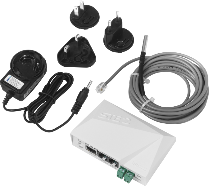 STE2 r2 je Ethernetový (nejen) teploměr pro vzdálené měření teploty, vlhkosti, kvality ovzduší, CO2 apod. Komunikace přes klasický ethernetový kabel, nebo Wi-Fi. V případě překročení povoleného rozsahu hodnot zasílá alarmové zprávy e-mailem až na dvě zvolené adresy. STE2 R2 je možné připojit do cloudové aplikace HWPortal.cz. Při použití SMS brány HWg-SMS-GW3 je alarm prozvoněním i SMS zprávou.